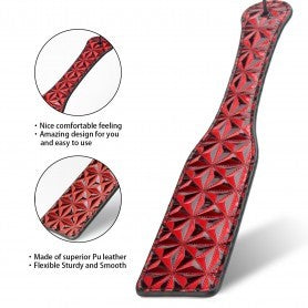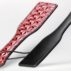 Palmeta BDSM perfecta para practicar Spanking e introducirse en el mundo BDSM. Dispone de un elegante diseño diamantado en una de sus caras, mientras que la otra es lisa. Predomina el Eco cuero como material principal, sin embargo, su interior incluye una barra metálica que proporciona estabilidad a la palmeta en su uso, asegurando un golpe certero. Incluye un cordón ideal para sostener en la muñeca. Muy cómoda para jugar y no daña la piel, tamaño perfecto y muy duradera.